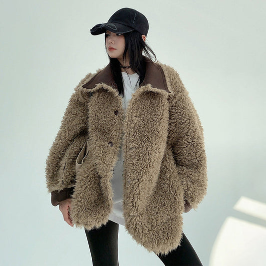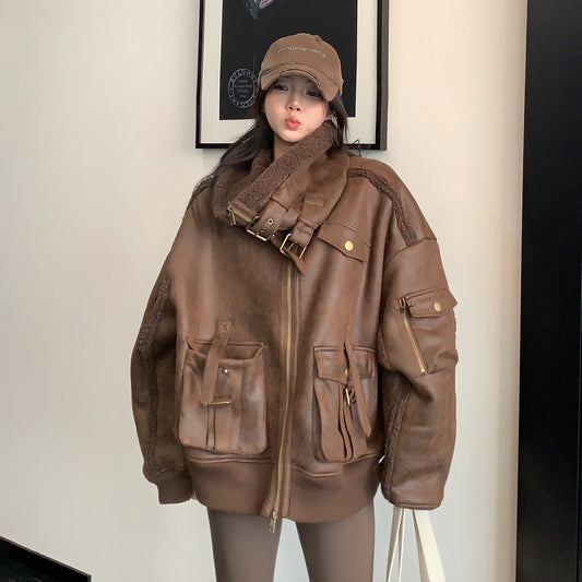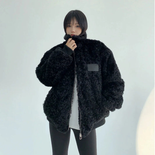 【アウター】甘め フェイクムートン厚手保温アウター 2025冬 若見え 防風 ハイネック ボアトップス レディース【JZシリーズ】