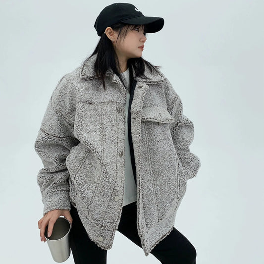【アウター】秋冬用 高級感 フェイクボア デニムジャケット レディース ビッグカラー 綿入れコート【SNシリーズ】