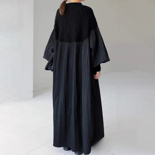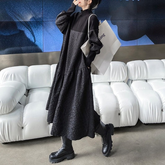 【ワンピース】春秋冬 レトロ ニット生地 スタンドネック ニットセーター切り替えし 長袖ワンピース【AHシリーズ】