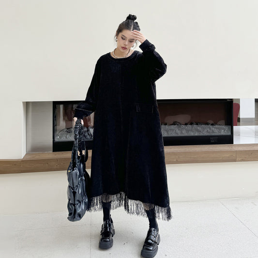 【ワンピース】韓国風 コーデュロイ×切替 フリンジデザイン 長袖ワンピース ゆるシルエット【JZシリーズ】
