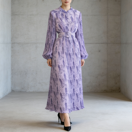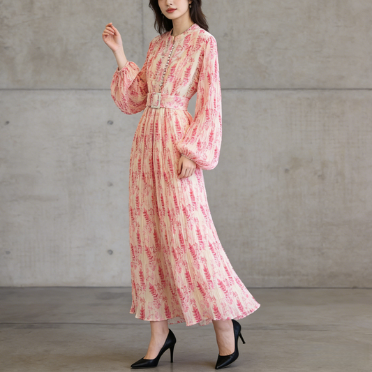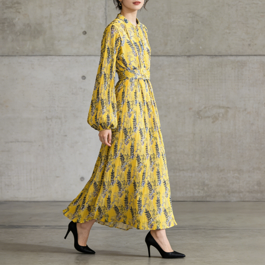 【ワンピース】スタンドカラー リボン付き Aライン プリント プリーツ 長袖 ワンピース 【SHシリーズ】