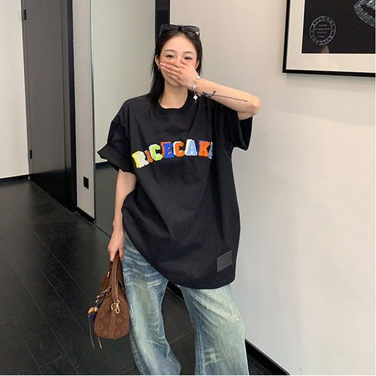 【トップス】ユニセックス 夏用 ヴィンテージ風 レザーアップリケ刺繍Tシャツ オーバーサイズ【FCシリーズ】