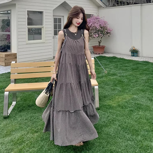 2点セット!【セットアップ】ドット柄 ティアード キャミワンピ 2点セット 体型カバー Aライン ロング丈 上品 きれいめ【SHシリーズ】
