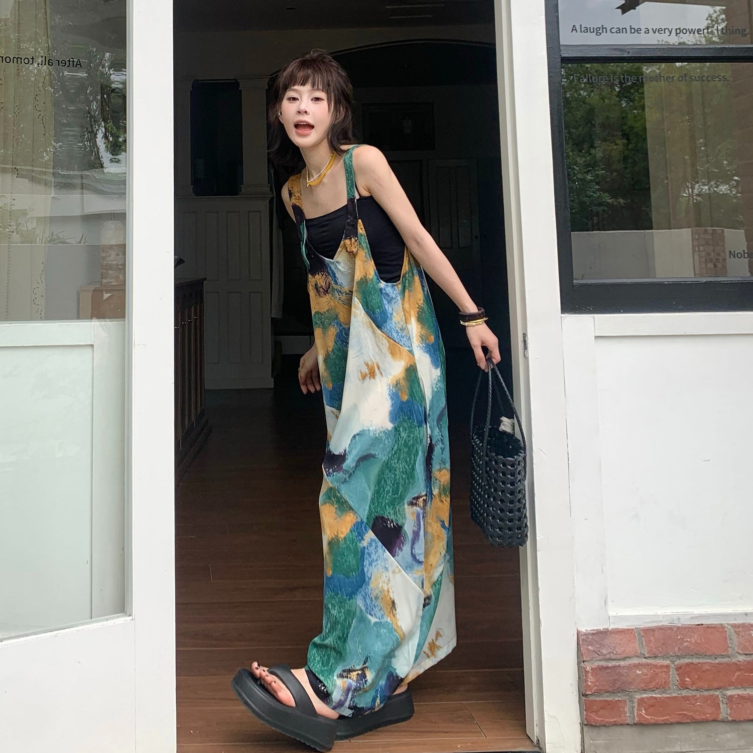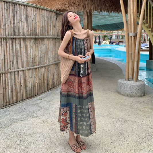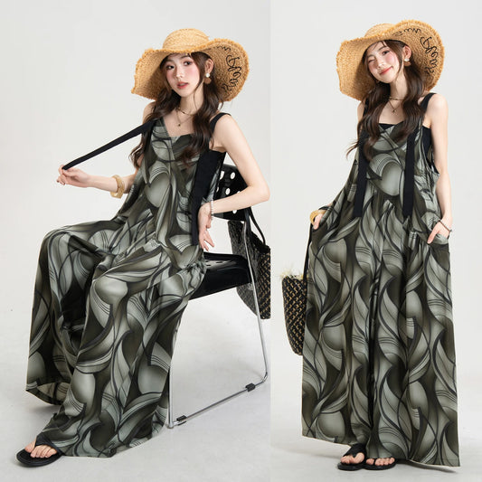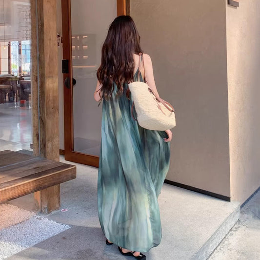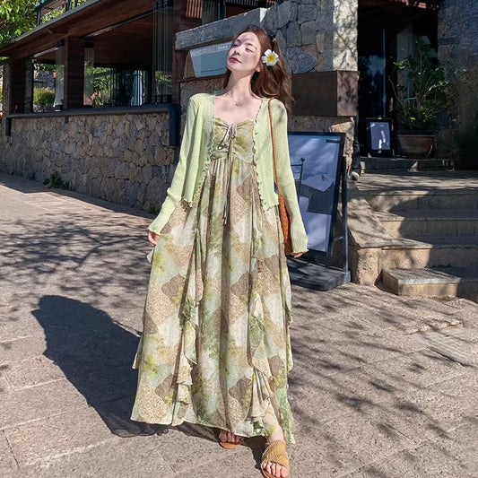 期間限定⭐️60%OFF【ワンピース】タイの海辺 リゾート風 グリーン プリント 肌を明るく見せる キャミソール ワンピース 【SHシリーズ】