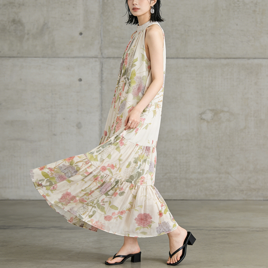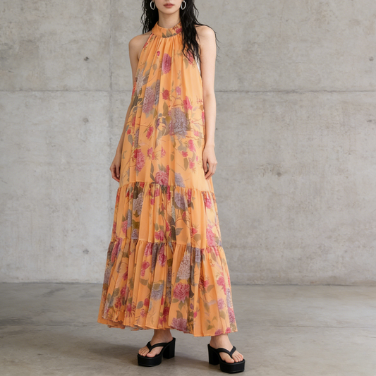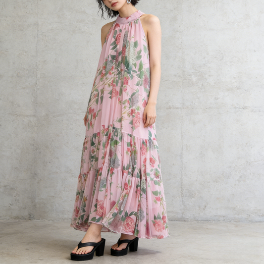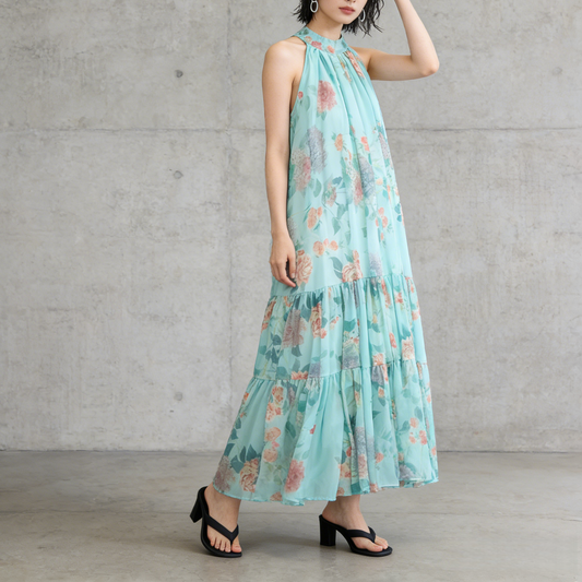 【ワンピース】リゾート ホルターネック バックオープン シフォン フレア ノースリーブ ビーチワンピース 【SHシリーズ】