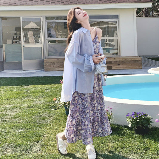 2点セット!【セットアップ】パープル 花柄 キャミワンピース シャツ付き 2点セット フレンチレトロ 日焼け対策 ロングワンピース【SHシリーズ】