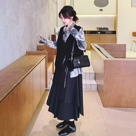 【セットアップ】こなれ感 ファッショナブル ベスト+水墨柄 シャツ+スカート セット 細見え 3点セット レディース【JZシリーズ】