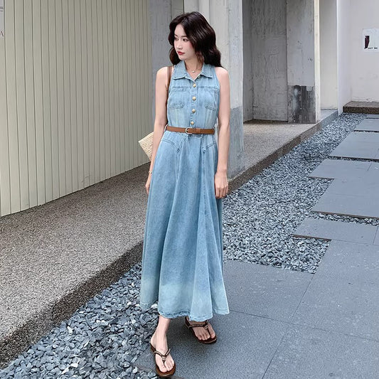 【ワンピース】デニムワンピース ノースリーブ フレンチレトロ ロング丈 ウエストマーク Aライン 大きいサイズ 着痩せ 体型カバー きれいめ 上品【JZシリーズ】