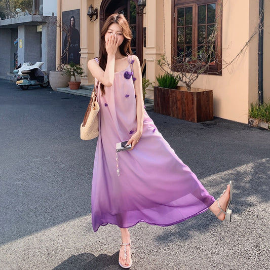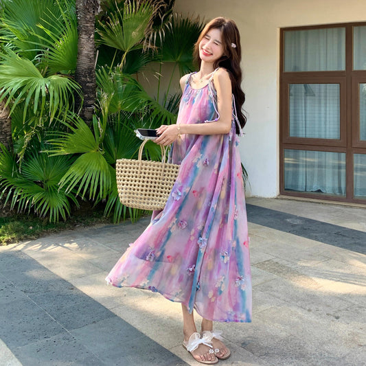 【ワンピース】タイダイ柄 ノースリーブワンピース 立体花 3Dフラワー 大きいサイズ キャミワンピ ロング丈 リゾート 体型カバー 着痩せ 上品【SHシリーズ】