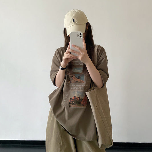【トップス】ブラウン系 アートプリント 半袖Tシャツ コットン ゆったりシルエット ナチュラル カジュアル トップス【FCシリーズ】