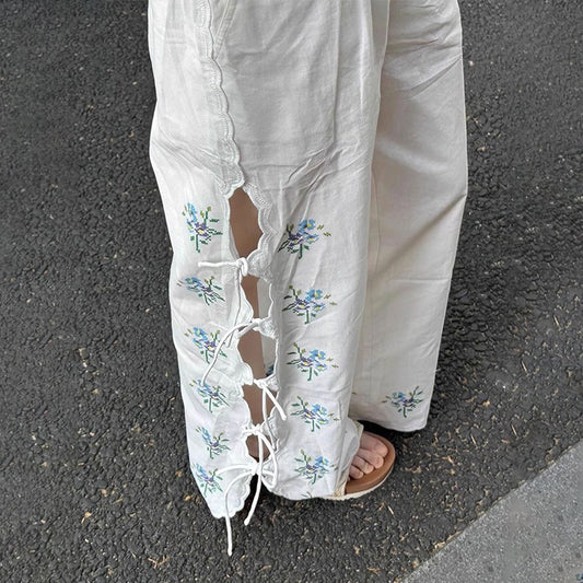 【ボトムス】刺繍 カットワーク ワイドパンツ レディース ハイウエスト リボン付き ストレートパンツ ゆったり デザイン性【SHシリーズ】