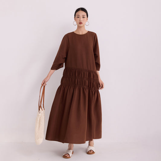【ワンピース】リラックス感漂う 気品あるワンピース レディース ヴィンテージ風 メラードカラー 通勤向け 七分袖ロングドレス【JZシリーズ】