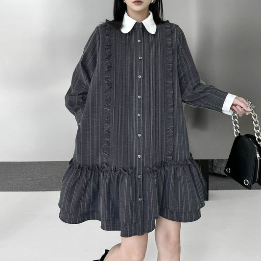 【ワンピース】ミニマル配色 グレーストライプ シャツワンピース 春 長袖 2WAYデザイン【AHシリーズ】