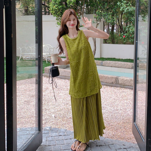 【ワンピース】レイヤード風 ノースリーブ プリーツワンピース ナチュラル 旅行 リゾート ロングドレス【SHシリーズ】