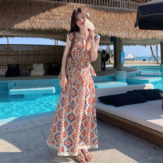 【ワンピース】ヴィンテージ 夏 ビーチリゾート デザイン性 エレガント Vネック 半袖ワンピース