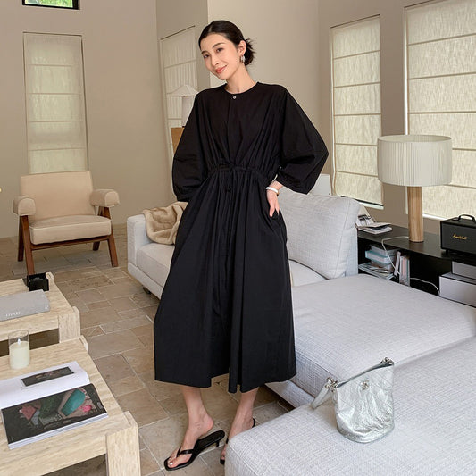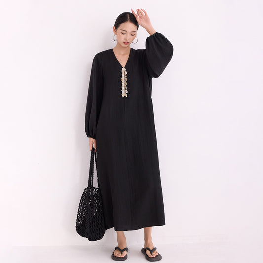【ワンピース】ブラックVネック シェルボタン付き 長袖Aライン ロングドレス レトロ&リラックス感漂うデザイン【JZシリーズ】