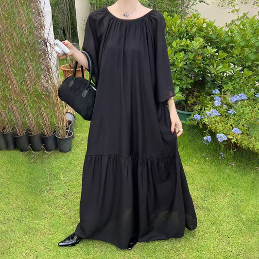 【ワンピース】春秋夏 韓国風 ゆったり プリーツ ラウンドネック 長袖ワンピース