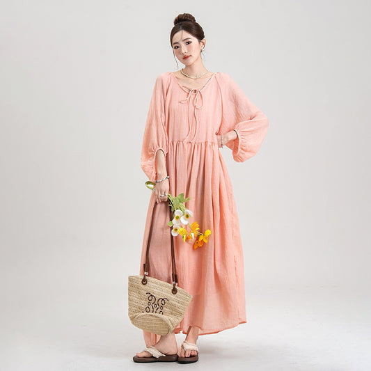 【ワンピース】キキョウピーチピンク リネン100% ワンピース レディース 春夏 Vネック ロングワンピース ゆったり フレア ナチュラル【JZシリーズ】