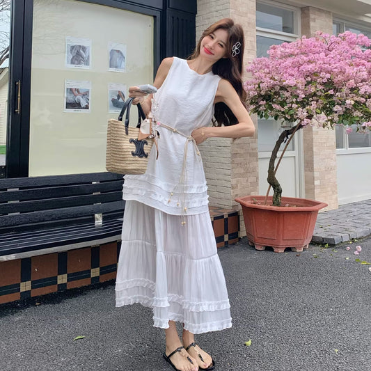 2点セット!【セットアップ】ワンピースセット夏 リゾート ジレ ベスト+キャミワンピ 大きいサイズ 着痩せ 体型カバー ロング丈【SHシリーズ】