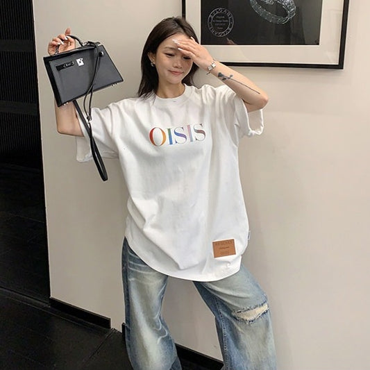 【トップス】ドーパミンカラー ミニマル ワッペン刺繍 オーバーサイズ Tシャツ 【FCシリーズ】