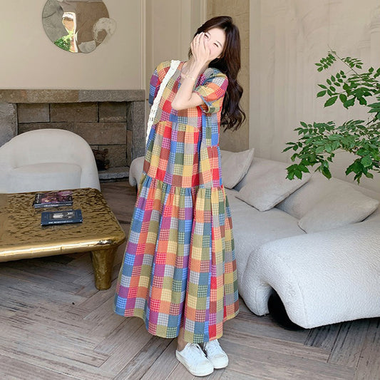 【ワンピース】ドーパミンカラー 甘めで若見え チェック柄カジュアル 細見えパフスリーブ半袖ワンピース【SHシリーズ】