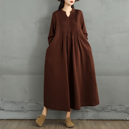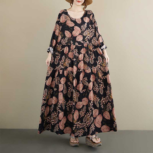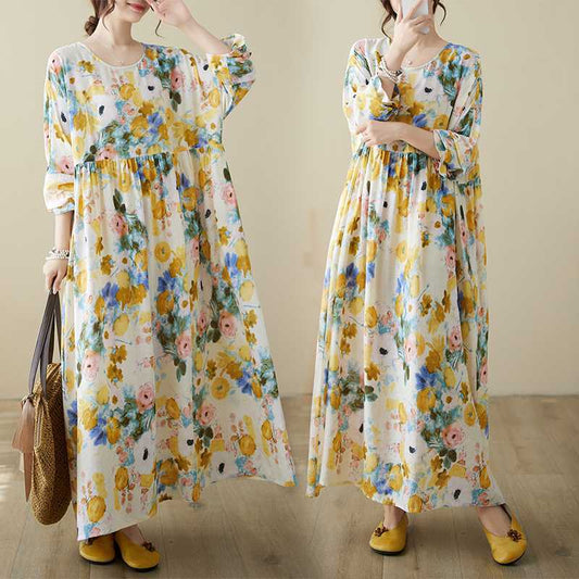60%OFF⭐️期間限定【ワンピース】厚手 花柄 プリント 丸首 ゆったり 大きいサイズ 体型カバー 文芸風 リゾート 長袖 ロングワンピース【SHシリーズ】