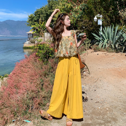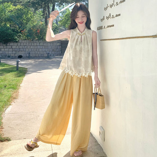 2点セット!【セットアップ】夏 レディース チャイナ風 ベスト ワイドパンツ 上下セット 黄色 イエロー 綺麗め 体型カバー 2026 リラックス 上品【JZシリーズ】