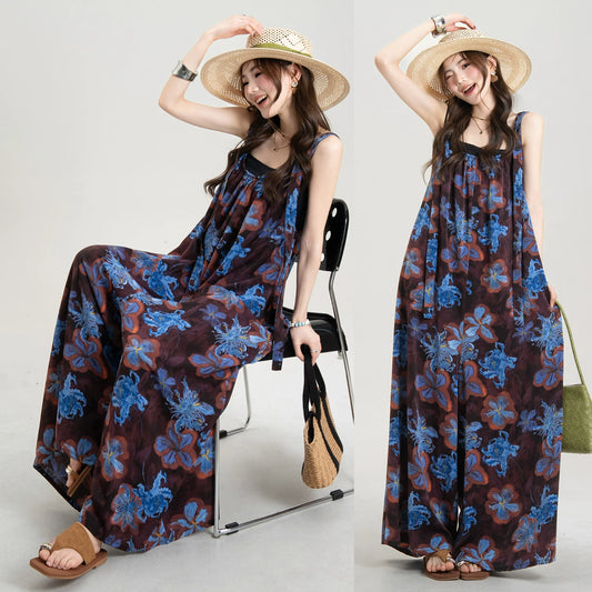 【ワンピース】リゾート風 夏 フレンチエレガンス ゆったりシルエット 足首丈 ノースリーブ花柄ワンピース【SHシリーズ】