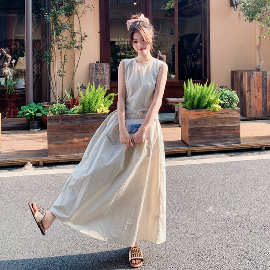 【ワンピース】夏新作 レトロ ゆったり細見え 無地 ノースリーブワンピース