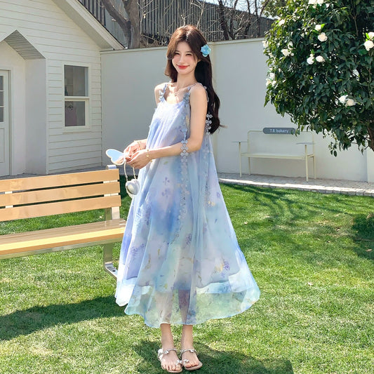【ワンピース】ブルー タイダイ柄 ノースリーブワンピース チュール キャミワンピ ロング丈大きいサイズ リゾート シアー 透け感 着痩せ【SHシリーズ】