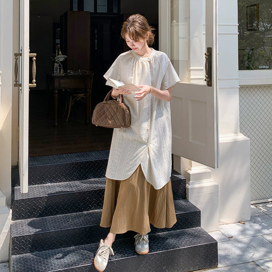 2点セット!【セットアップ】スタンドカラー シャツ フレアスカート 上下セット 上品 きれいめ 体型カバー ゆったり ミモレ丈【JZシリーズ】
