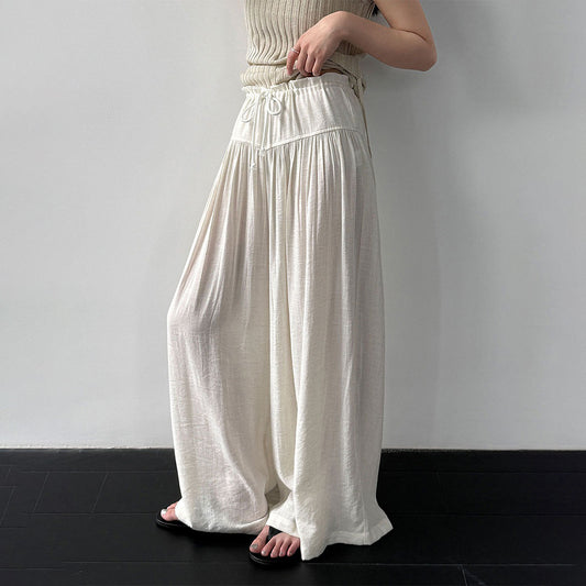 【ボトムス】リネン混 ハイウエスト ドローストリング ワイドパンツ レディース 夏 スカート風 ガウチョパンツ ゆったり 体型カバー【JZシリーズ】