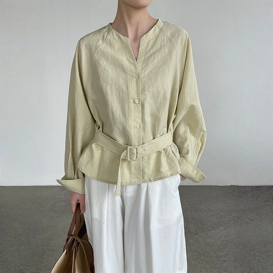 【トップス】ウエストシェイプ Vネック 通勤スタイル リボン付き シャツ 【JZシリーズ】