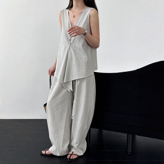 【セットアップ】テンセル×リネン ノースリーブ ストライプトップス + カジュアルロングパンツ 2点上下セット 【JZシリーズ】