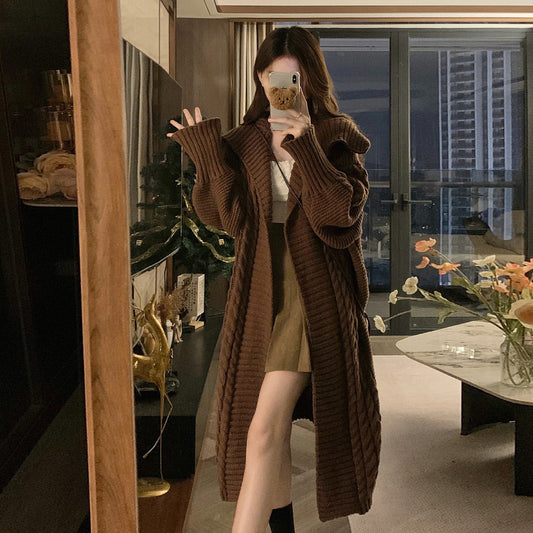 【アウター】リラックス感 キャメル 大きめ襟 ケーブル編み ニットカーディガン 中長丈 【JZシリーズ】