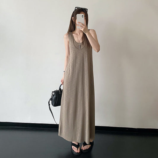 【ワンピース】夏新作 レイヤードデザイン ノースリーブ ワンピース 大きめクルーネック リゾート 旅行 ロングドレス【FCシリーズ】