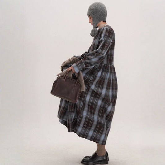 【ワンピース】起毛素材 チェック柄 レトロ クルーネック 長袖 ワンピース 【JZシリーズ】