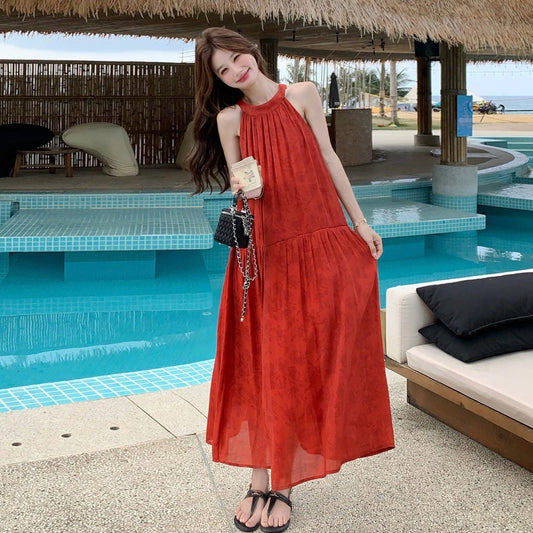 【ワンピース】夏新作 レッド ジャガード ホルターネック ワンピース オリエンタル レトロ 海辺 リゾート ロング丈【SHシリーズ】