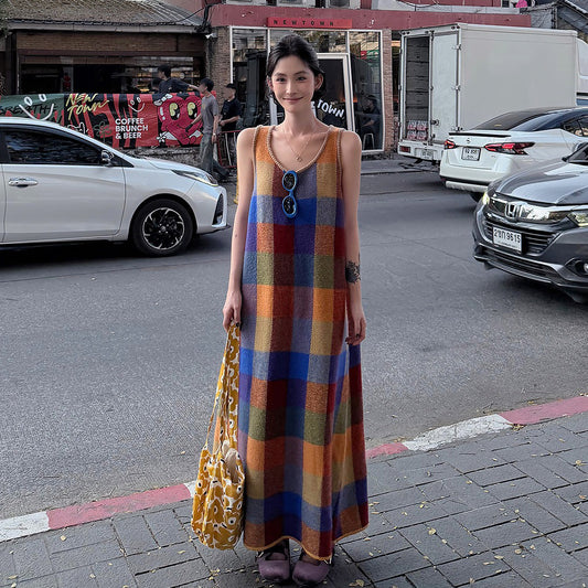 【ワンピース】カラフルチェック Uネックノースリーブオフショルダーワンピース レディース 夏新作 韓国風 ゆったりAラインロングドレス【SHシリーズ】