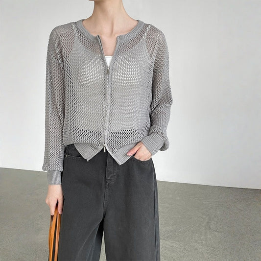 【アウター】透かし編み ジップアップ ニットカーディガン 【JZシリーズ】