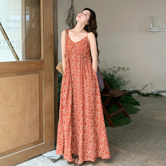 【ワンピース】夏新作 レッド 幾何柄 キャミワンピース ボヘミアン風 海辺 旅行 リゾート 着痩せ リラックス ロング丈【SHシリーズ】