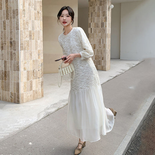 【ワンピース】ベージュ フラワーレース刺繍襟 ワンピース レディース 新作 長袖 フェミニン フレンチ風ロングドレス【JZシリーズ】