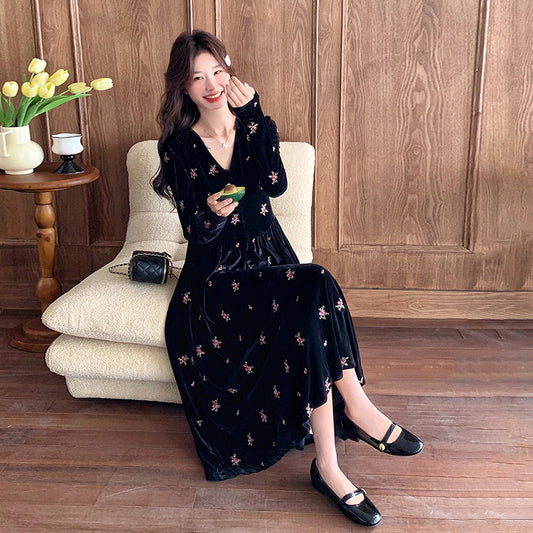 【ワンピース】春 秋 冬 大人フェミニン フレンチレトロ 刺繍 ベルベット 気質よい 長袖ワンピース【SHシリーズ】