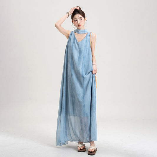 【ワンピース】セーヌ風 ブルーグラデーション ホルターネック シアーワンピース レディース 夏 ノースリーブ ロングドレス リゾートコーデ 大人可愛い 上品【SHシリーズ】