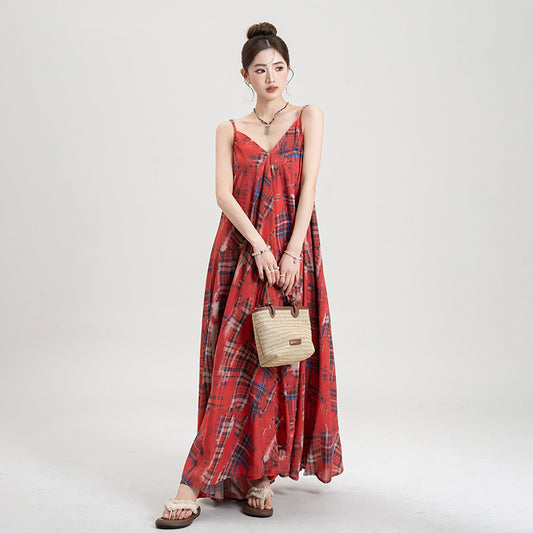 【ワンピース】チェック ワンピース レディース 夏 キャミワンピース ロング丈 ゆったり 人気 フレンチ風 上品 フェミニン リゾートコーデ【SHシリーズ】