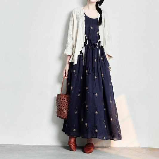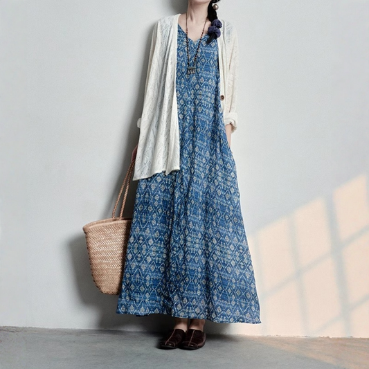 【ワンピース】ロング丈 プリント 上品な雰囲気 リネン素材 長袖 ワンピース 【SHシリーズ】