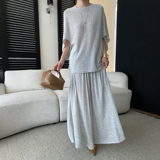 【セットアップ】ルーズでリラックス感 ドルマンスリーブ ニットトップス + ウエストゴム ハイウエストスカート 2点上下セット【JZシリーズ】