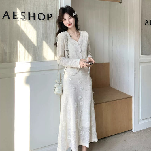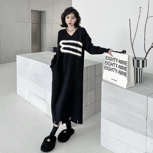 【ワンピース】Vネック ジャカードニットワンピース 秋冬 厚手 ルーズ トレンド 長袖 ロングワンピ【AHシリーズ】