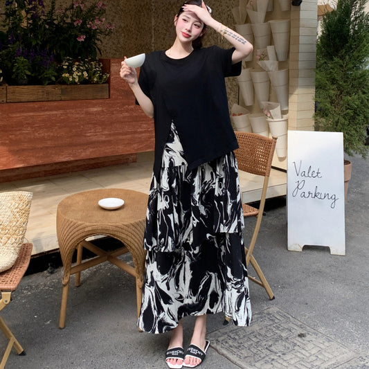 【ワンピース】🌞夏新作 大きいサイズ レディース 半袖 重ね着風ワンピース 墨柄 ゆったり ロング丈 体型カバー【SHシリーズ】
