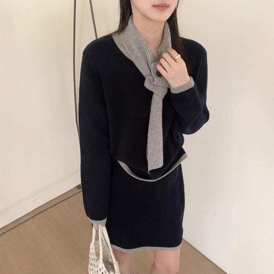 【セットアップ】韓国風 リラックス 配色デザイン ツイード風 ニットトップス+ミニスカート+マフラー 3点上下セット レディース【JZシリーズ】
